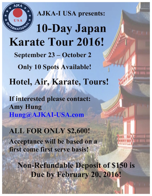 January 24-26 : Seminar Winter Karate Symposium INFORMATION PACKET Location: The Solebury Club – 4612 Hughesian Dr, Buckingham, PA 18912 Contact: Rob DeAngelis: 215.794.3494 rdeangelis@thesoleburyclub.com February 1-2: Seminar INFORMATION PACKET / REGISTRATION FORM Location: Fontana Karate-Do – 16857 Foothill Blvd, Fontana, CA Contact: Stan Money: karatestanley@yahoo.com March 2: Tournament New York’s International Karate-do Open Championship…