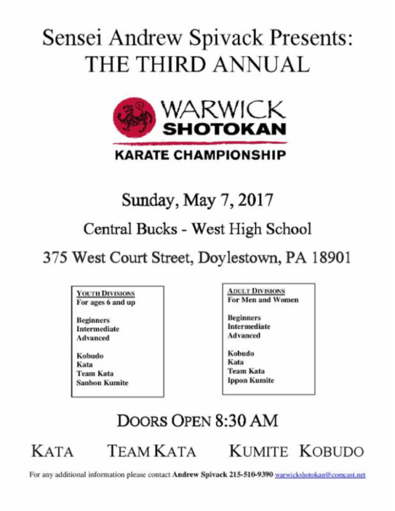10:00 AM Tournament will begin with Kobudo, followed by Team Kata, Kata and Kumite